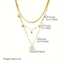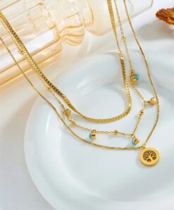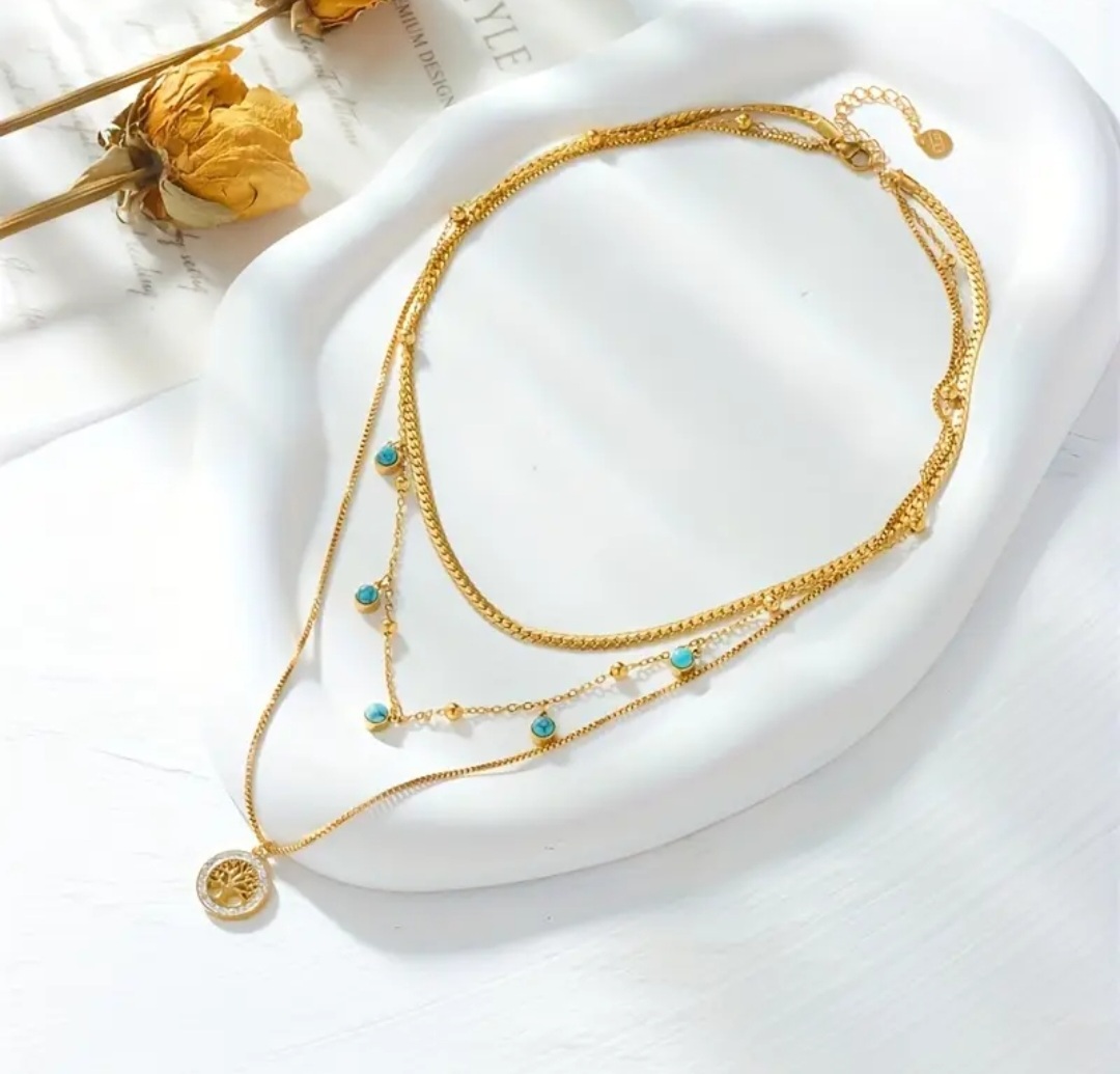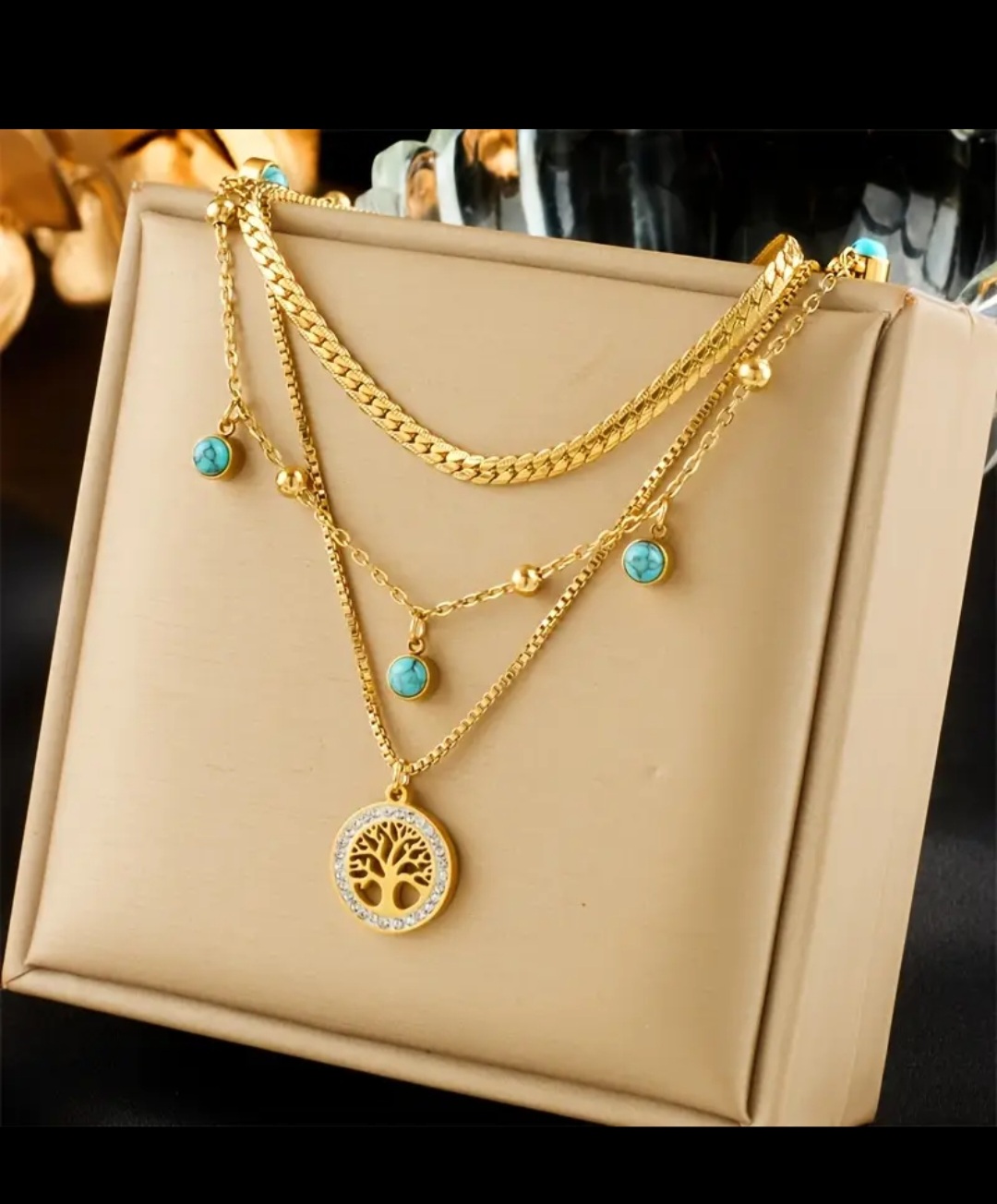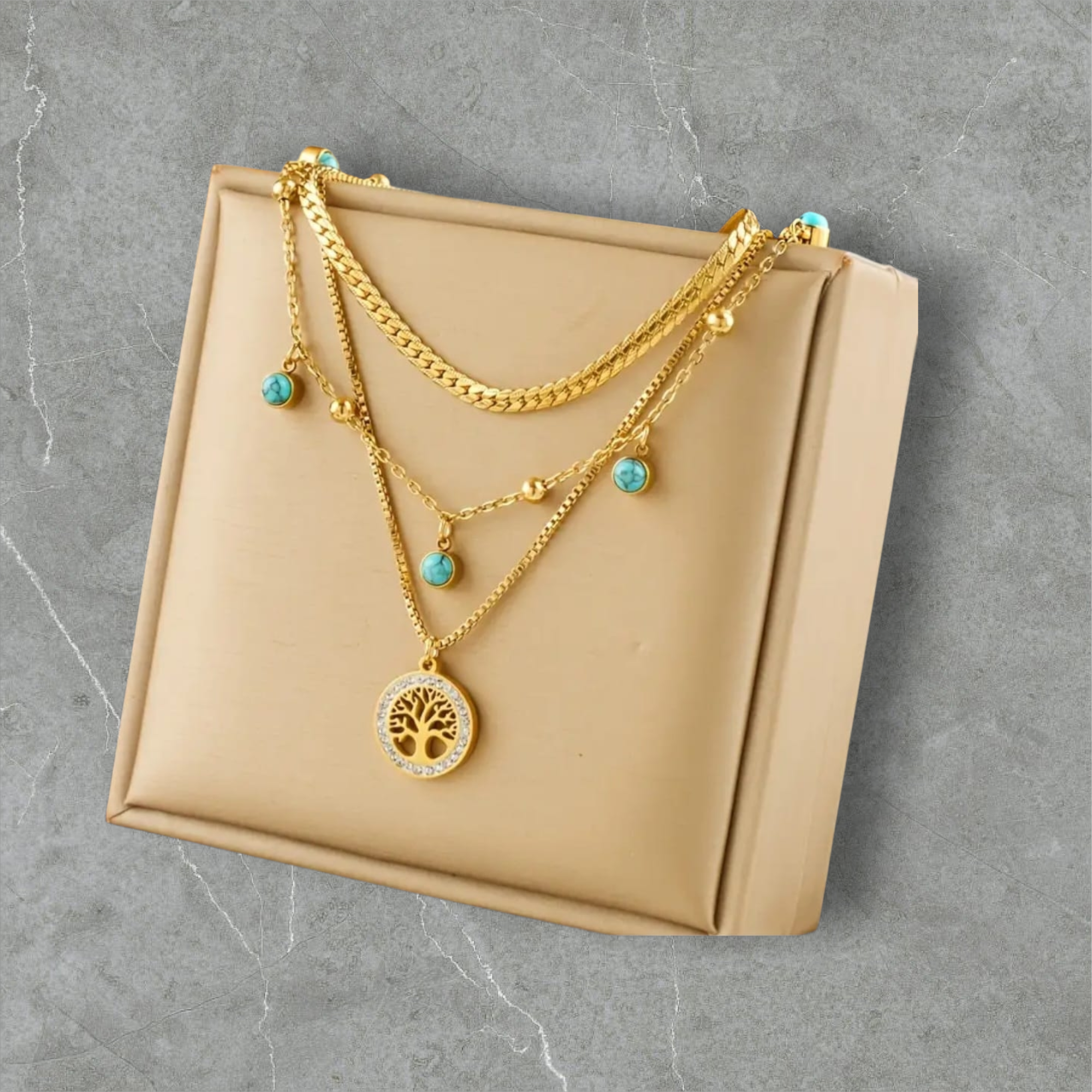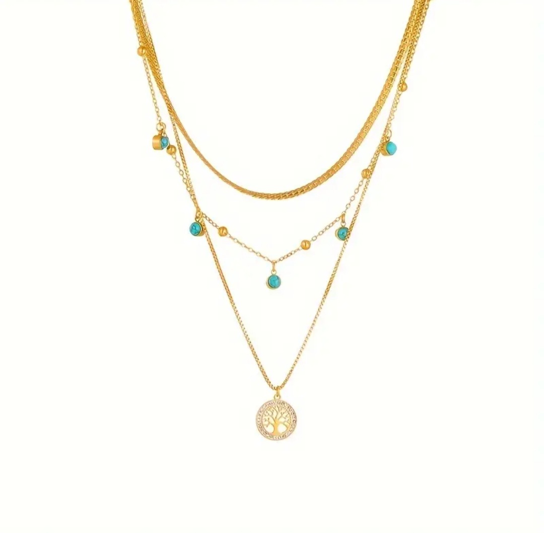 The Aurelia Tree of Life Layered Necklace is a beautifully crafted statement piece that blends elegance with meaning. Designed with a luxurious gold-tone finish, this layered necklace features a bold curb chain paired with delicate chains accented with vibrant turquoise stones. At the centre sits a stunning Tree of Life pendant, symbolising strength, growth, and connection. The subtle crystal detailing around the pendant adds a refined sparkle, while the turquoise accents bring a fresh, eye-catching contrast to the warm gold tones.
