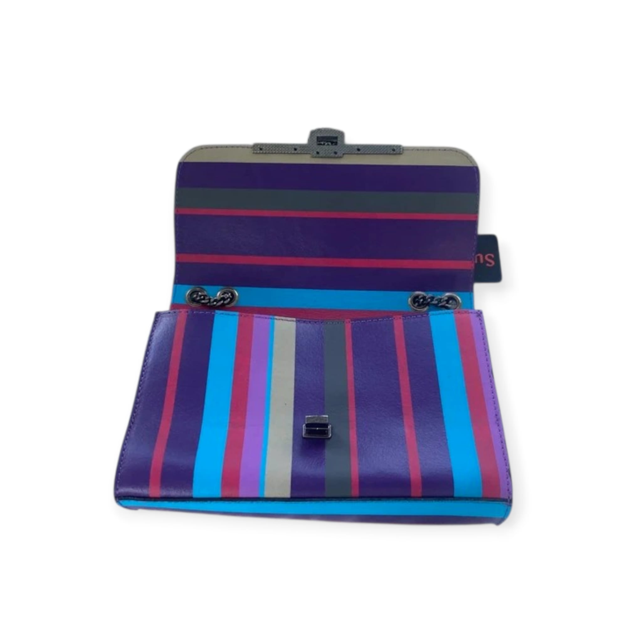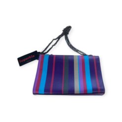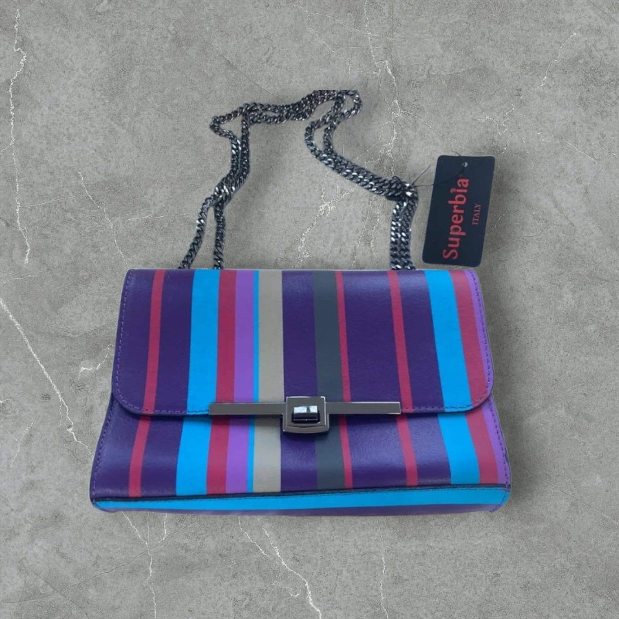 Turn heads effortlessly with the Superbia Milano Clutch, a striking Italian-inspired statement piece designed for modern elegance. Featuring a bold multi-tone stripe design in rich jewel hues, this luxury clutch blends sophistication with contemporary edge. Crafted with a structured silhouette and finished with a sleek metallic clasp, it offers both style and practicality. The detachable chain strap allows you to wear it as a chic shoulder bag or carry it as a refined clutch for evening occasions.