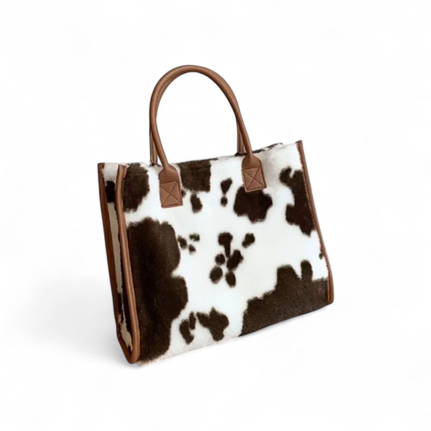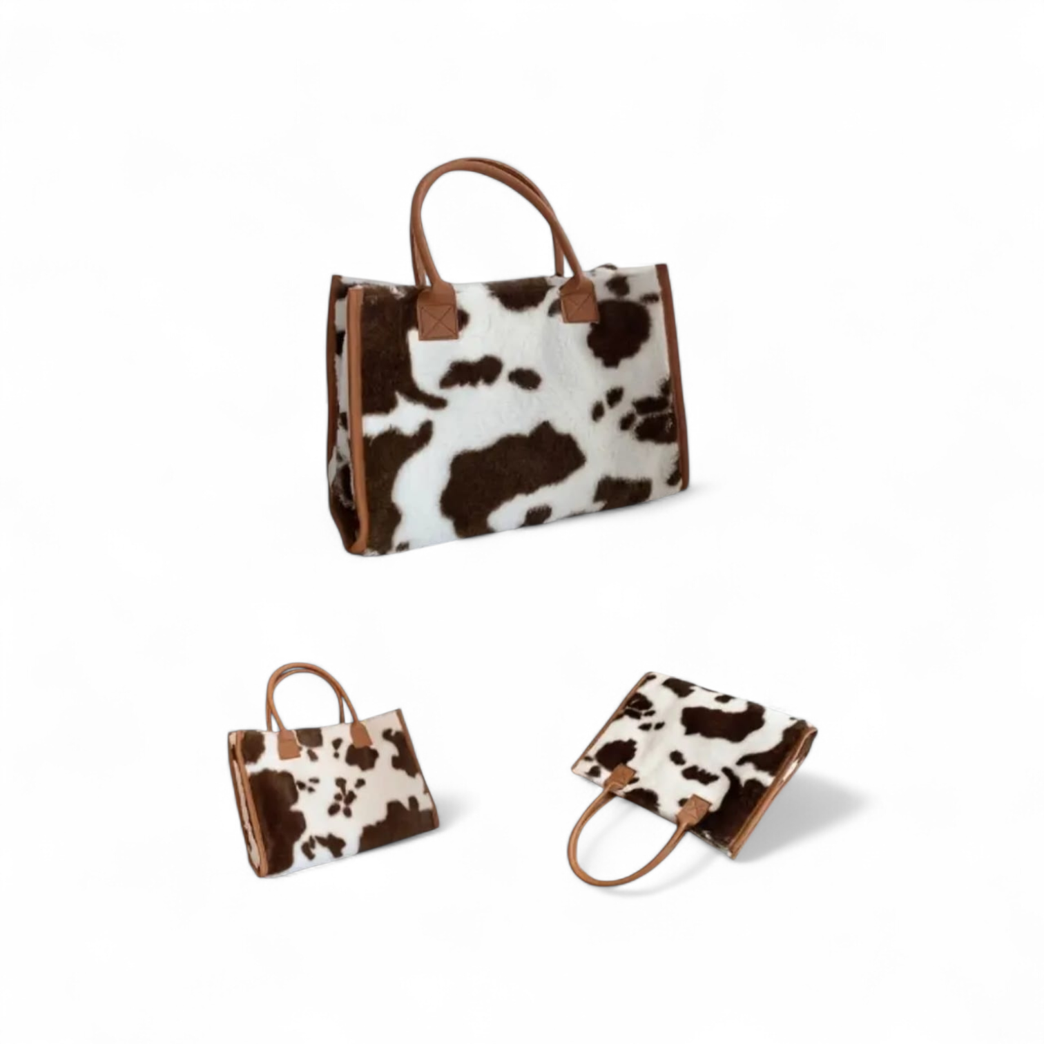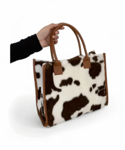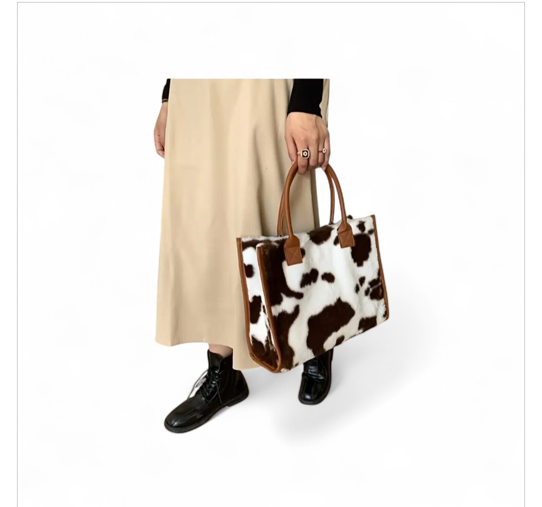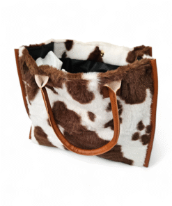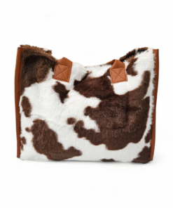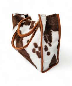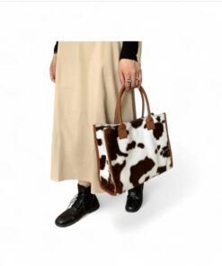 Make a bold style statement with this ultimate blend of modern fashion and timeless elegance. Featuring a striking cow print finish, this bag instantly elevates any outfit while remaining effortlessly chic. The structured silhouette is beautifully framed with rich tan leather trim and sturdy top handles. It is perfect for carrying your daily essentials without compromising on elegance.